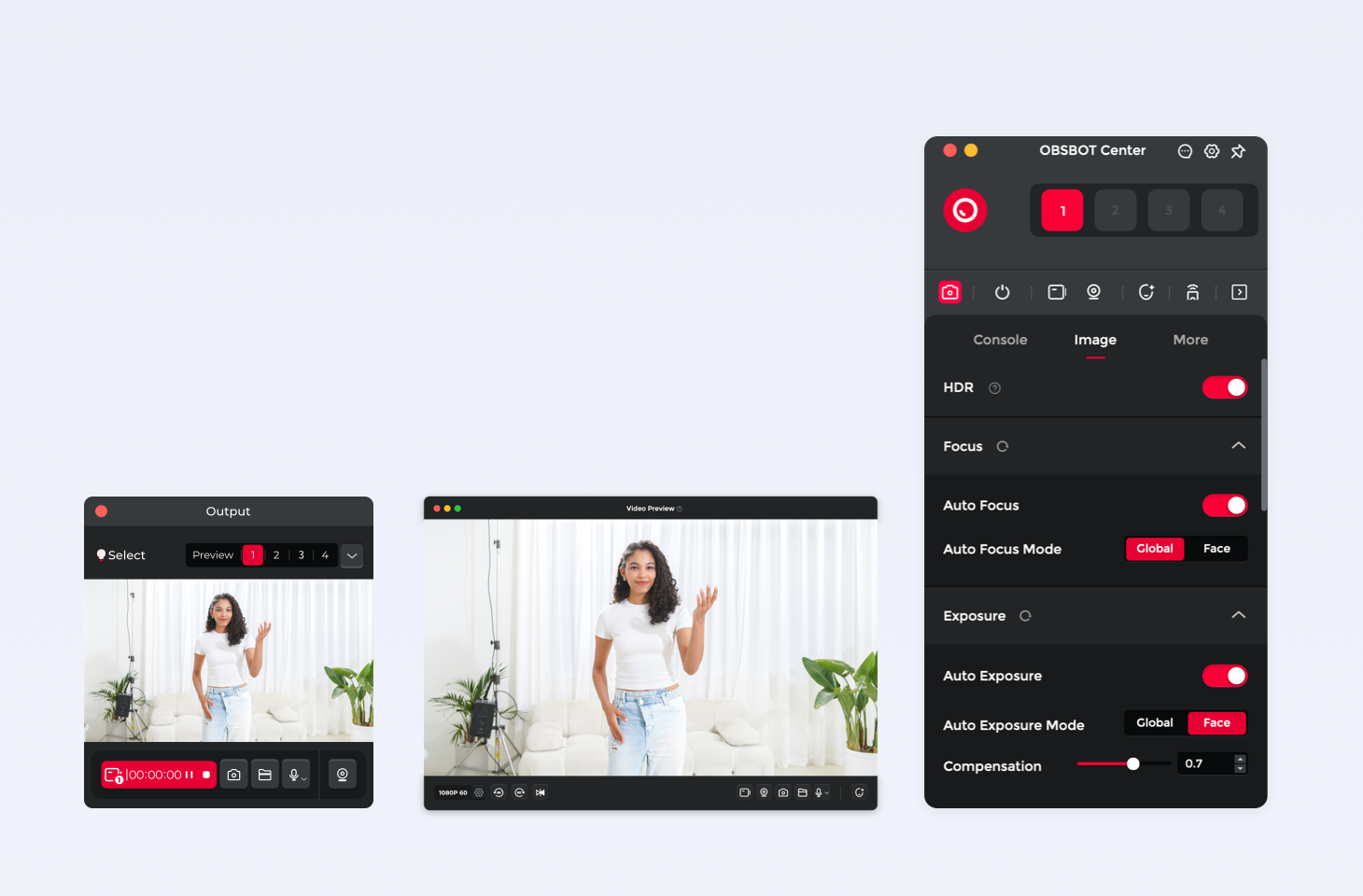 Effortlessly enhance look with Beauty Mode, eliminate distraction using Background Bokeh, switch between OBSBOT devices, and fine-tune various image settings—all in OBSBOT Center.